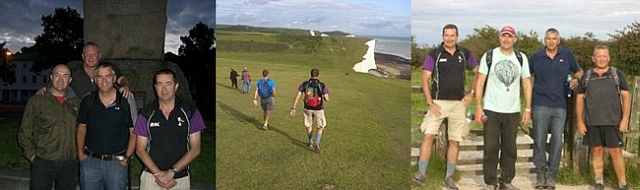The next day we had to be up at 4am to dress our feet (poor Jill!!), have breakfast and get driven out to Devils Dyke by 6am (we decided to do the walk in stages, leaving the middle section till last so people could join us at the end). It was freezing and blowing a gale, not a great start! But the scenery soon cheered us up and when the sun arrived the stunning views kept us thinking how lucky we were to be out walking. 9.30am and Jill was waiting with Breakfast and plasters near Lewis and then it was off to Alfriston, we were all now understanding what a challenge this walk was, Carl and Sean's feet were in a bad way, both were in real pain. The unevenness of the paths (especially the flints and chalk) were taking their toll on all our legs and causing friction on parts of our feet that were becoming raw and very sensitive. But we all managed the long trek to lunch, which we all desperately needed. We had taken some advice about nutrition and were drinking and eating all the right things, but we also managed to eat vast amounts of delicious cake (thanks Sally) so although we were all tired we seemed to have plenty of energy. We set off from Alfiston at about 3.30 knowing we had the challenge of 7 sisters to come. And did they come!! After arriving at the stunning Cuckmere river mouth we ascended up onto the cliffs, what an awe inspiring site, the sun was perfect and you could see for ever….. and that was the problem, the end just didn’t seem in site! My calculations had gone badly wrong, I had thought we had about 4 miles to go, it was closer to 7, and they were 7 of the longest miles we have ever walked. Carl and Dave were happy at a faster pace so marched on in front, Sean and I took a more conservative (very slow)pace and spent time enjoying the view…. well that’s a lie, Sean's feet were in a real mess, his years of smoking also telling (he gave up a few years ago, but it seemed too late) and my feet felt very odd too so we had no choice but to crawl along. The rolling hills of the sisters were a real challenge, not only the steep up slopes, but it seemed the downslopes hurt even more, thighs were burning, calves cramping. Just as it was getting dark at 8pm, we staggered down the steepest hill of all to the official end point of the South Downs way on Eastbourne promenade. After 14 hours we couldn’t even manage a beer. Blisters were now a real problem as plasters/tape/compede etc. had fused together with our skin, and yes…when you took them off, off came the skin. The thought of walking another day with no skin on either heal was not that appealing!! 37 miles today in 14 hours.